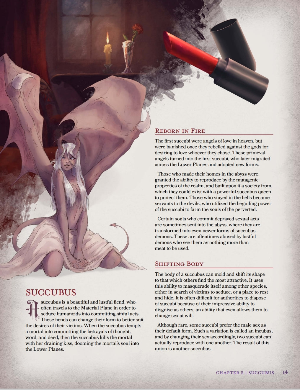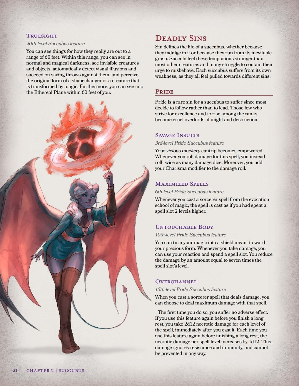 -The Succubus. A seductive fiend from the lower planes, you will corrupt and control your enemies with your potent sorcerous spells. Featuring 4 subclasses dependent on the sin which swayed your wicked soul: Pride, Lust, Vanity, or Wrath.