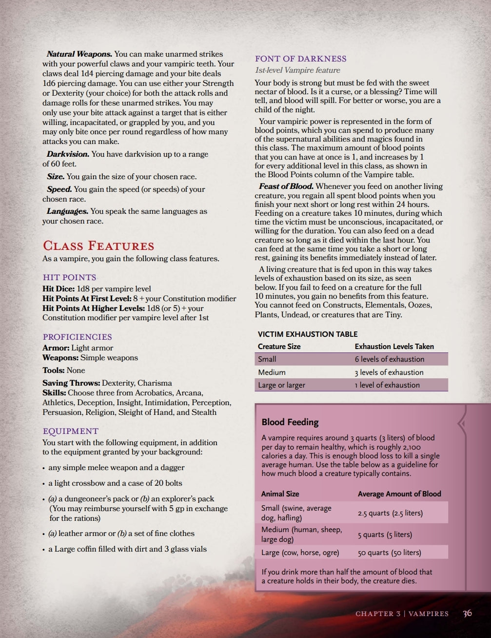-The Vampire. An extremely versatile class with a ton of roleplay potential and robust customizability. As a vampire you will have to maneuver around your undead restrictions and need for blood, but in return you will be rewarded with powerful features and game-changing abilities.