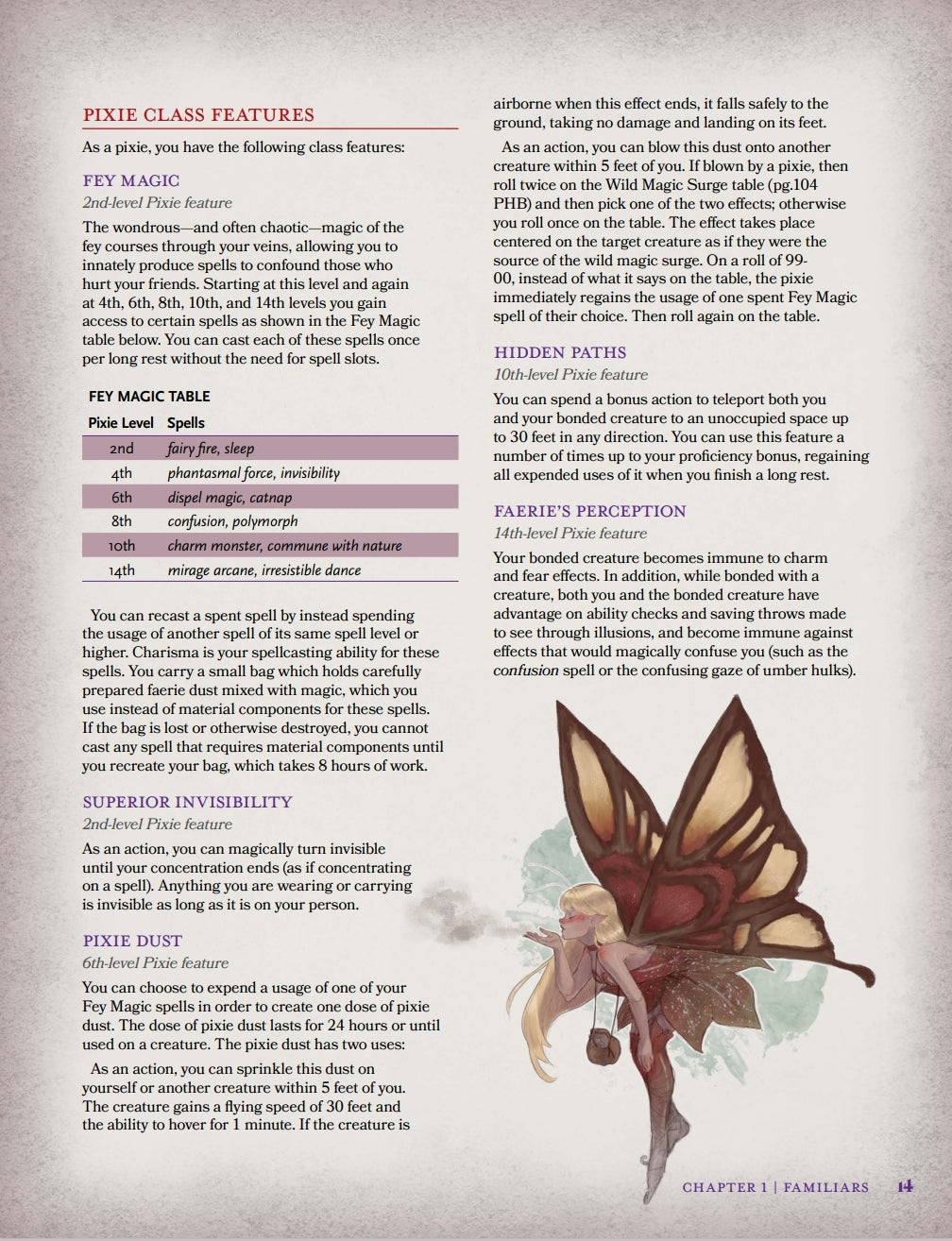 -The Familiar. Featuring the pseudodragon, the pixie, and the animal familiar; play as a tiny creature whose role is to support the rest of the party. Your abilities allow you to bond onto any creature in order to improve their survivability and damage. Fight together or perish alone, the familiar is fantastic for players who wish to coordinate with other players.