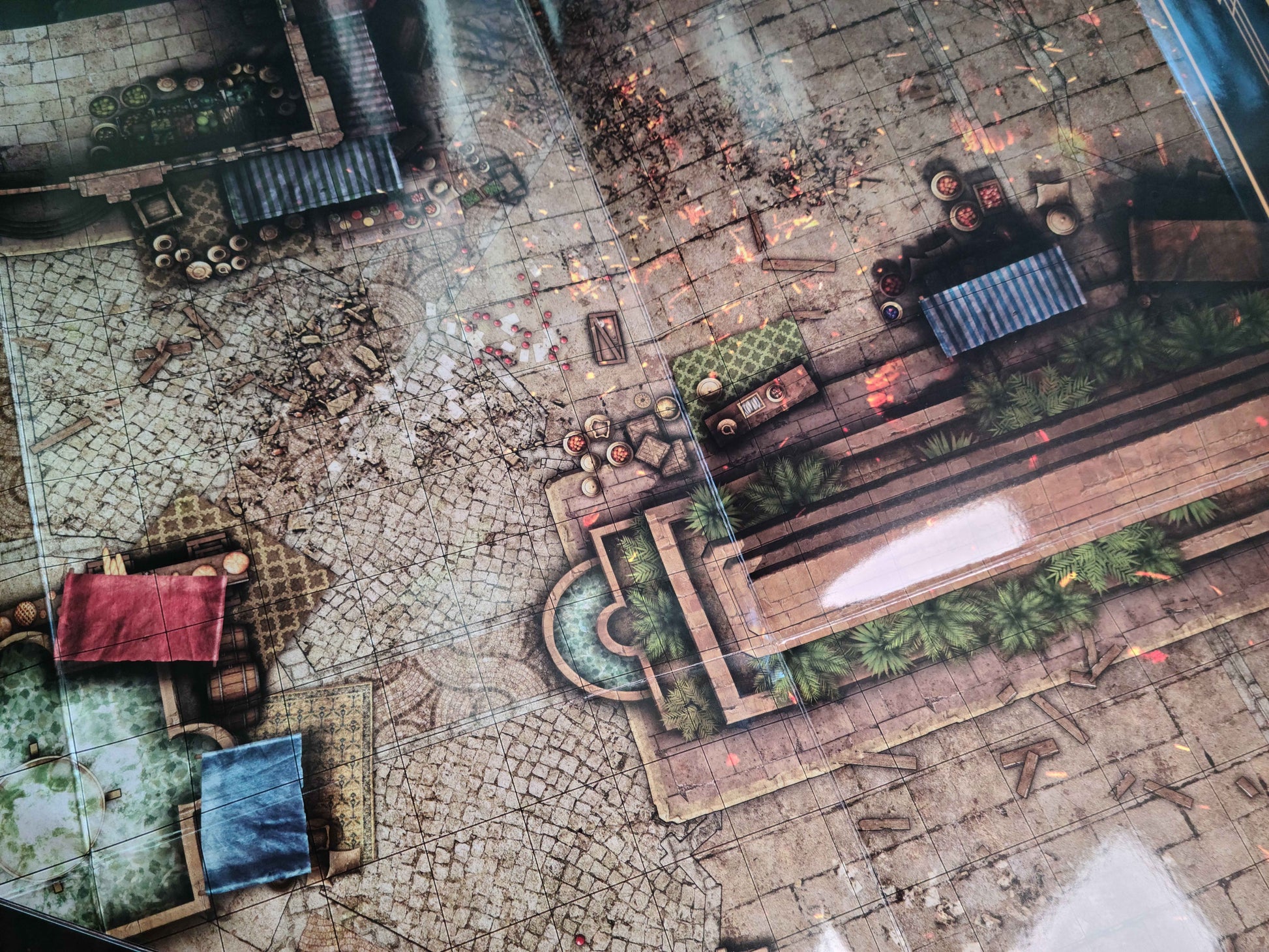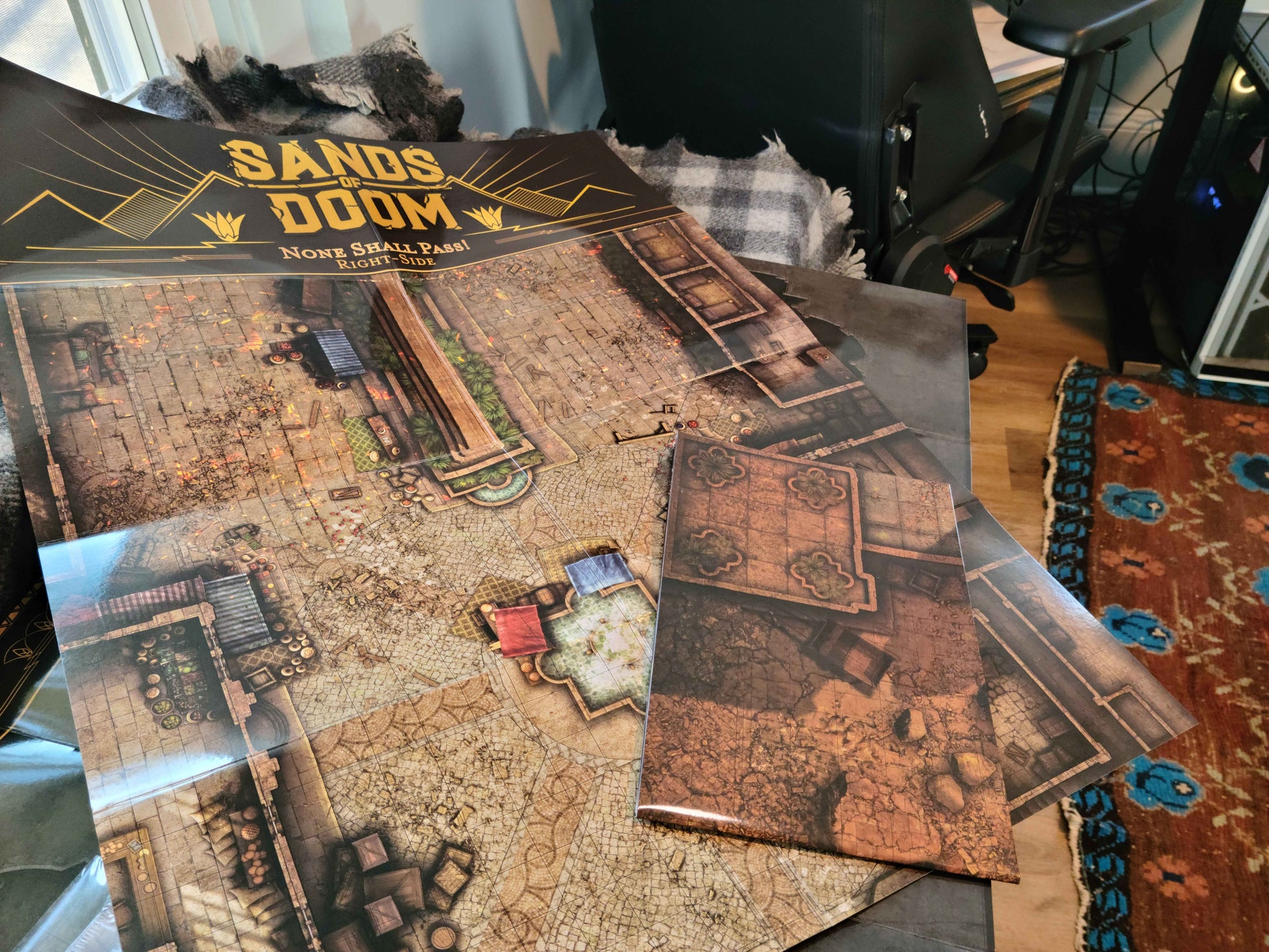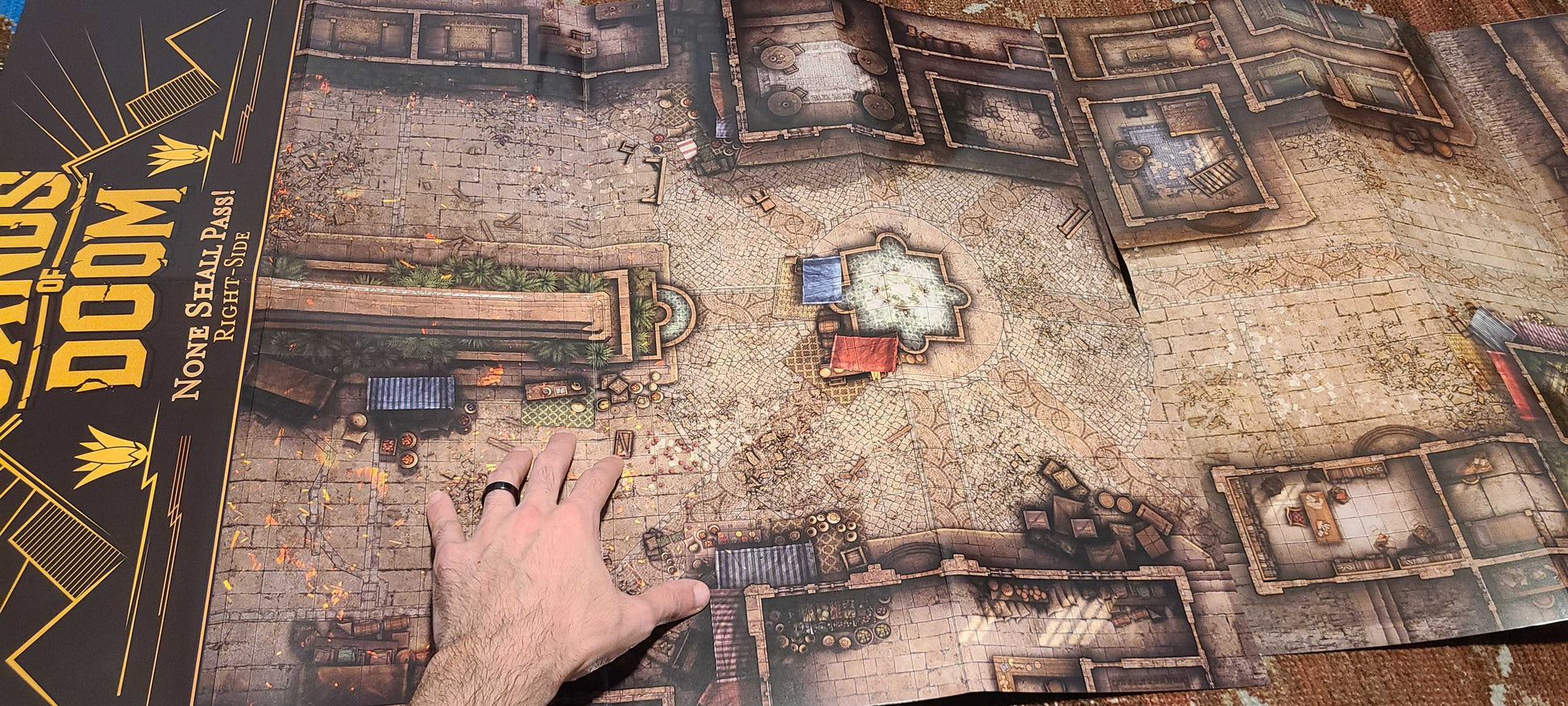 This collection of poster-sized battlemaps covers every encounter from The Siege of Al’Kirat, the climactic final chapter of Sands of Doom. Designed for large-scale play, these maps bring the chaos and spectacle of the siege directly to your table. The set contains seven full maps printed across five oversized posters (some posters are double-sided).