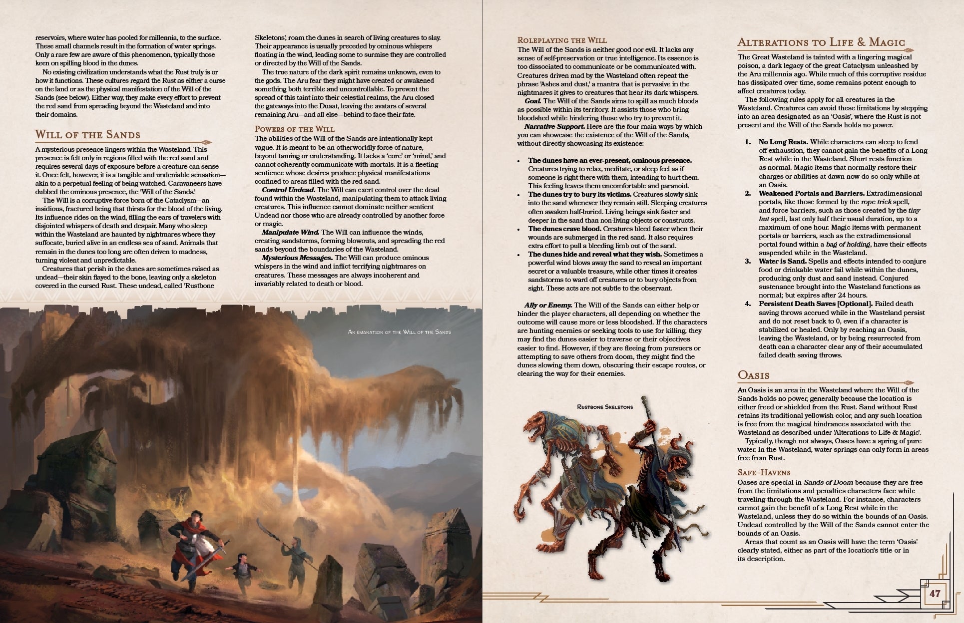 Full Adventure. In Sands of Doom, players venture into Kirat—a blistering desert realm of ancient buried cities, cursed dunes, and sun-scorched badlands. Within its 360 pages are 3 chapters of rich worldbuilding and 8 chapters of a gritty, perilous campaign where heroes must cross the shifting sands to stop an ancient evil from consuming the land. The book includes appendices filled with dozens of monster stat blocks, 14 Divine Relics—artifact-level magical items the players must uncover to empower themselves—and 9 unique, desert-themed magic items designed for surviving the harsh Wasteland.
