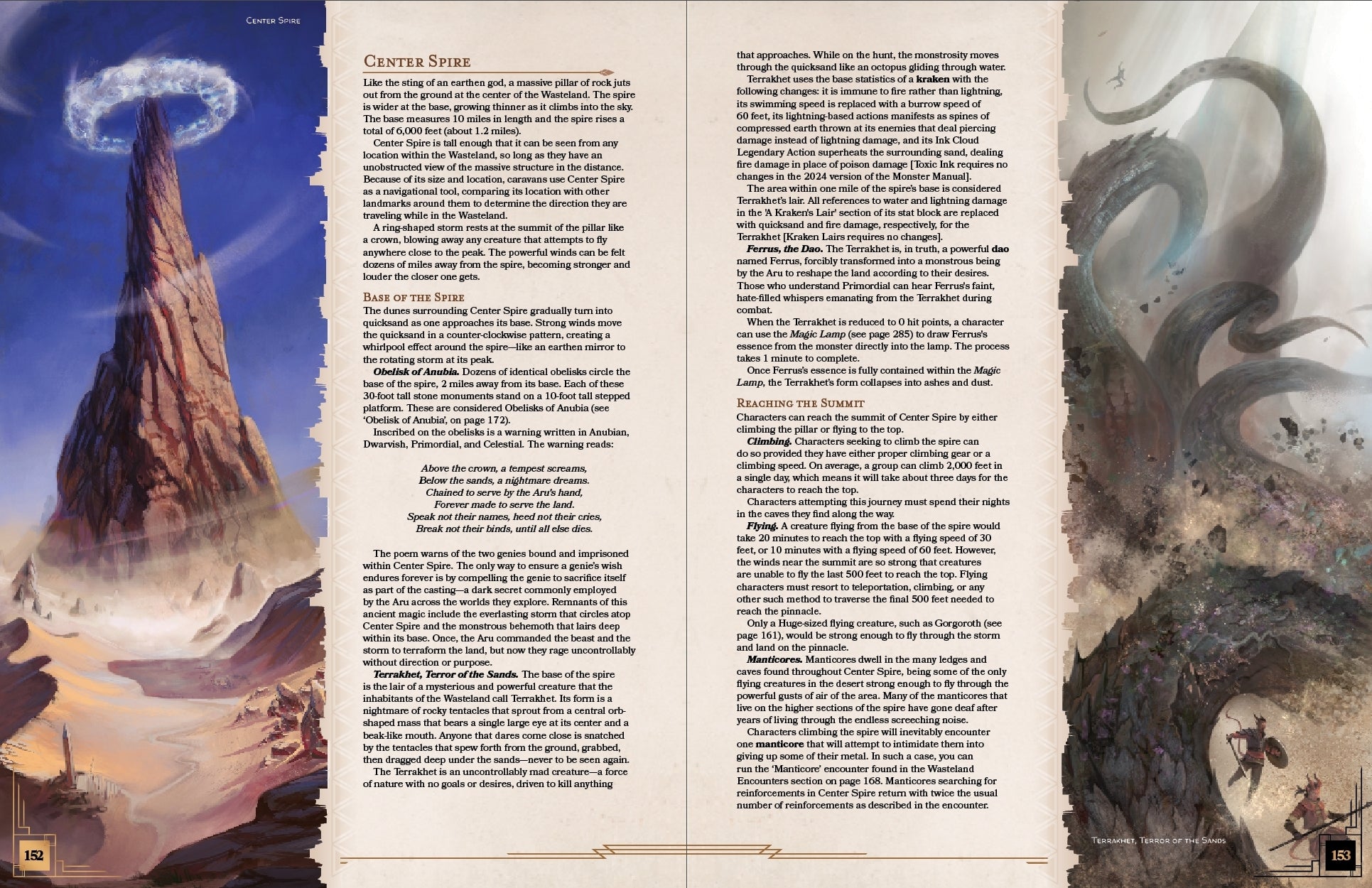 Bound Genies. Scattered across the cursed dunes of Kirat are four imprisoned genies—each holding the power to grant a single grand wish. To support the GM, the book provides detailed rules for handling wishes in and out of combat, including the Unbreakable Laws of Wishes—absolute principles that all genies must follow or risk death when fulfilling a wish.